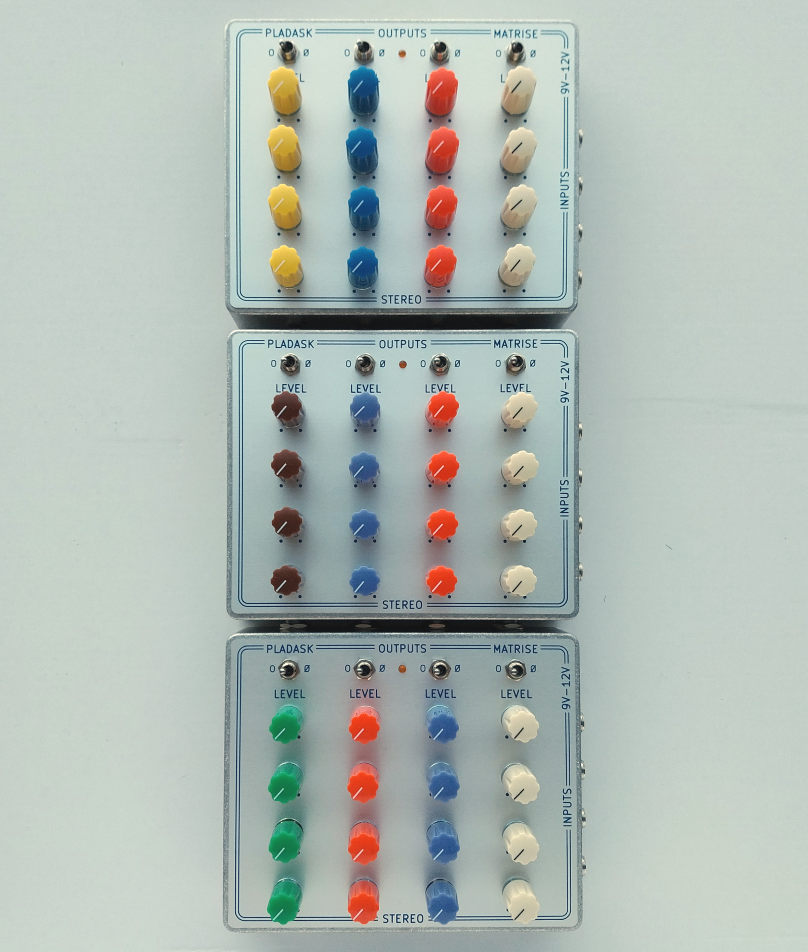 STEREO MATRISE is an active matrix audio mixer sporting four stereo inputs, four stereo outputs, sixteen level adjustment knobs and individual phase inversion switches for each of the four stereo output channels. This makes for a powerful tool to experiment with signal routing and feedback loops. Among other things the device can be used to run parallel effect loops or amplifiers, add a clean-blend to an effect, or regenerate effects or even the mixer itself.